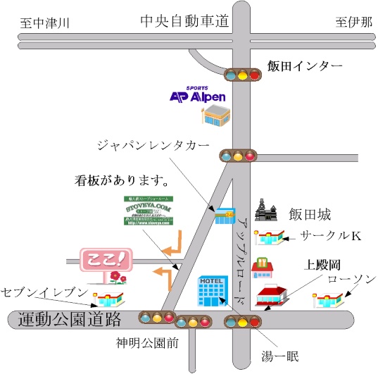 飯田インターからアップルロードへ、上殿岡交差点信号機を右折し運動公園通り沿いから右折すると看板が目印です